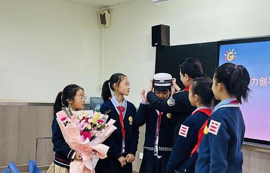 小路警官與李才峰警官還走到同學們身邊,親切地與孩子們互動。李警官向孩子們介紹了警徽、警號、肩章的含義,將自己的警帽摘下讓孩子們試戴。