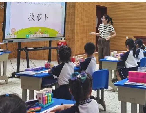 此外,傅玉婷教师执教了一节研讨课《拔萝卜——两位数加两位数》。在讲堂上,傅教师以听算开端了两位数加两位数的学习,听算标题紧贴本单元的学习内容,带领孩子们稳固了“相同计数单位的个数相加减”。本课在“拔萝卜”的情境中展开,在傅教师的带领下,学生利用小棒、数位桶和计数器,积极探索两位数加两位数的计算方法,发现计算的进程其实就是在把“两位数加两位数”转化成了之前学过的“整十数加整十数”“两位数加一位数”“两位数加整十数”,将新常识和旧常识之间勾连了起来。清晰了计算进程后,孩子们开端测验找到算法背后的算理,发现不管怎么转化,都是在算“3个十加2个十”“6个一加3个一”,也就是在把“相同计数单位的个数相加”。